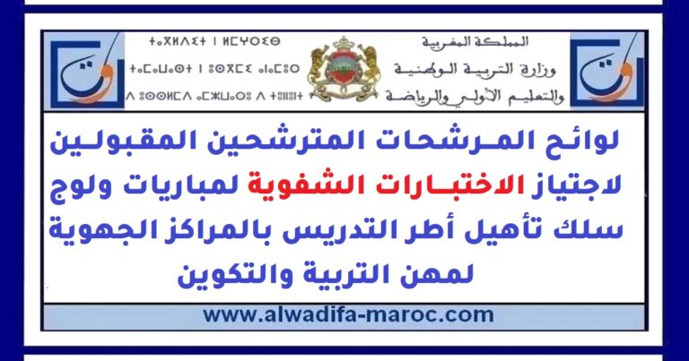 تعلن وزارة التربية الوطنية والتعليم الأولي والرياضة عن نشر لوائح المترشحات والمترشحين المدعوين لاجتياز الاختبارات الشفوية لمباريات ولوج مسلك تأهيل أطر التدريس بالمراكز الجهوية لمهن التربية – دورة نونبر 2025.