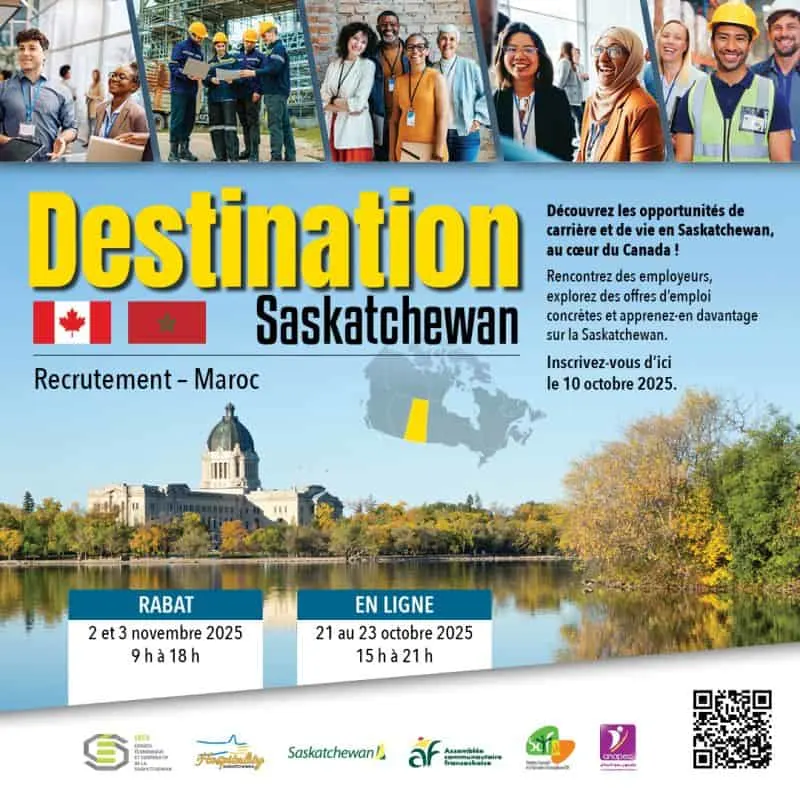 تدعو مقاطعة ساسكاتشوان (Saskatchewan) بكندا الكفاءات المغربية للمشاركة في مبادرة Destination Saskatchewan، وهي فعالية توظيف مخصصة للمهنيين المغاربة، إما بالحضور المباشر في الرباط أو عن بُعد عبر الإنترنت.